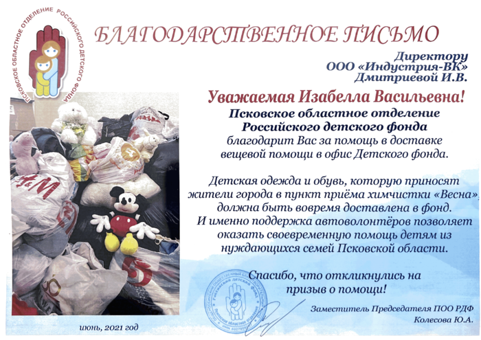 Уже несколько лет, Индустрия-ВК, в лице директора Дмитриевой Изабеллы Васильевны, участвует в благотворительных акциях, помогая нуждающимся семьям и детям из интернатных учреждений.